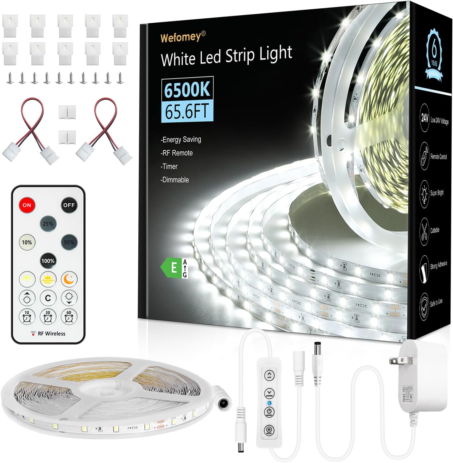 | Included Components | 32.8ft 24V COB LED strip light 2700K-6500K white, RF remote control, controller, UL Listed DC 24V 48W power supply, COB led strip connectors 2Pin 8mm, mounting brackets |