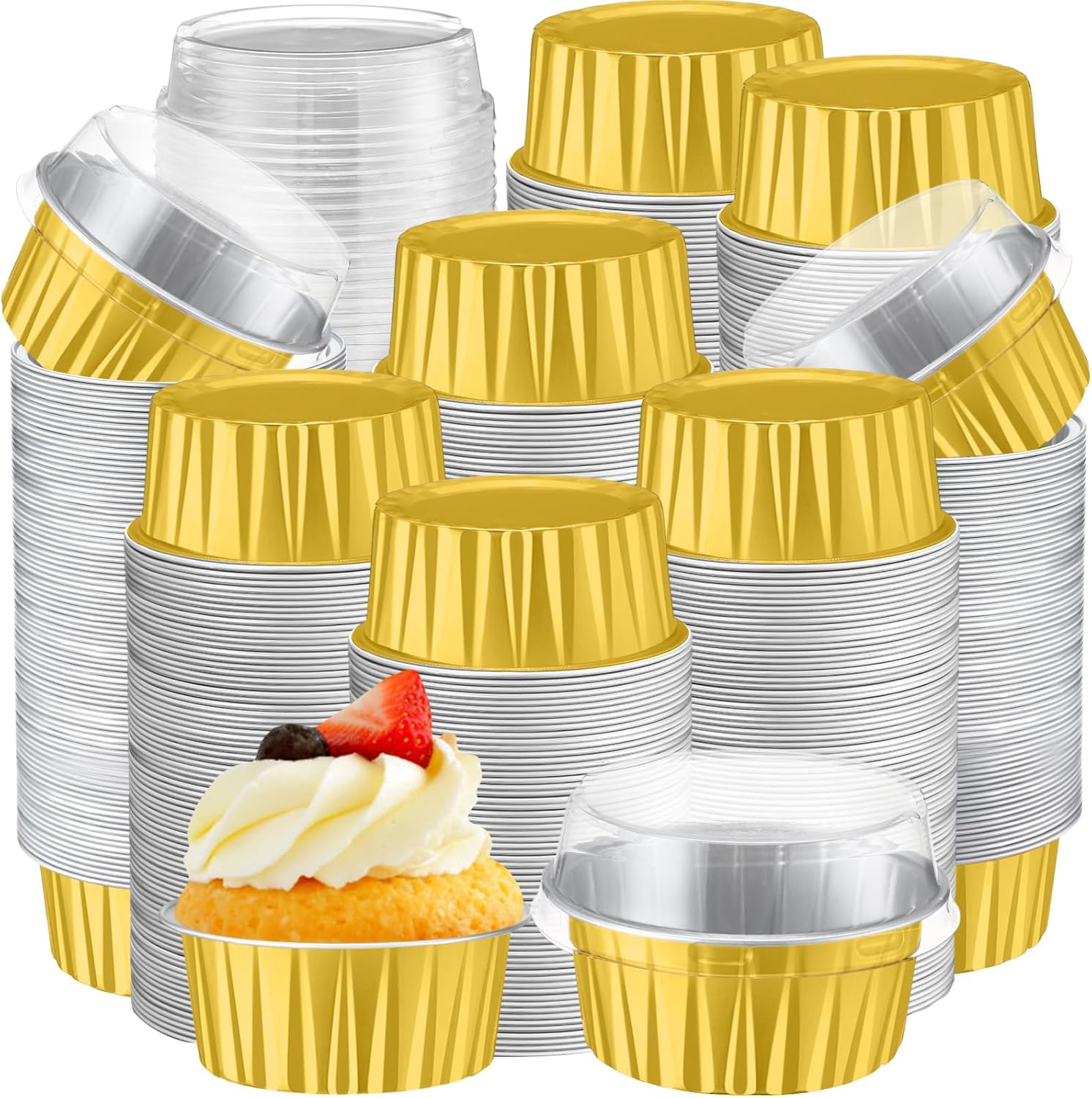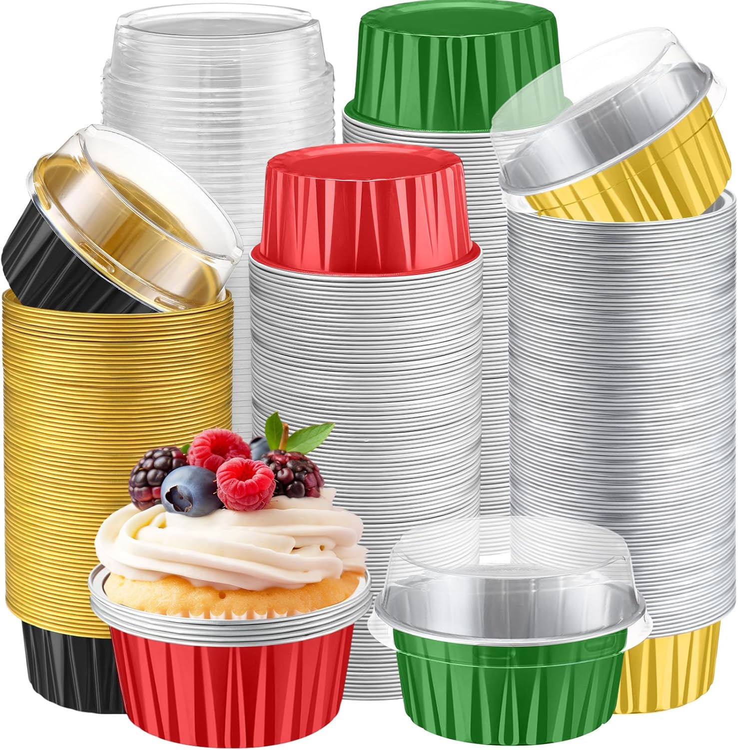 Feature: Seal: Our aluminum muffin cups are made of quality material, safe to use, can withstand high temperatures. Each cup is attached with a lid to keep your food from leakage and tipping. Extensive usages: The cupcake baking cups are suitable for family use, bakeries and restaurants, also suitable for various occasions, such as weddings, baby showers, anniversaries, birthdays, parties, picnics and camping. Specifications: Material: aluminum foil, plastic Color: 3 mixed color, silver inner layer Capacity: 5 oz/ 125 ml The diameter of the top: 3.35 inches The diameter of the bottom: 2.56 inches The height with lid: 2.1 inches Package includes: 400 x Disposable ramekins with lids Notes: Please do not put the lids into the oven. Manual measurement, please allow slight errors on size. The color may exist slight difference due to different screen displays