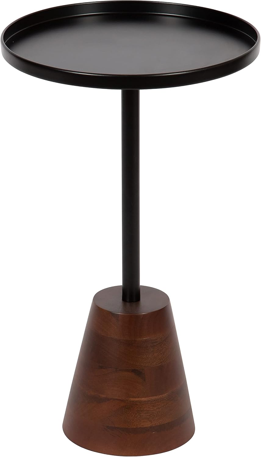 Introducing the Kate and Laurel Tira round side table, a captivating blend of modern glam and natural elegance. The striking combination of the antique brass tabletop and the mid-century walnut brown base creates a luxurious aesthetic that is sure to impress. The brass tabletop also features a slight lip to contain your items and prevent spills and additional damage. This charming cocktail table is a beautiful accent for serving and placing drinks when friends are around due to its protective lip and sturdy solid wood base. Its compact size and round design allow for easy placement and rearrangement to suit your needs. This exquisite circular end table boasts dimensions of 14 inches wide by 23.25 inches high, making it the perfect companion for your living room, bedroom, or any space in need of a stylish accent piece. Whether you place it next to your sofa, by your bedside, or in a cozy reading nook, this versatile side table effortlessly enhances any space. The circular shape promotes a harmonious flow. It also offers ample surface area for holding drinks, snacks, or a good book within arm's reach.