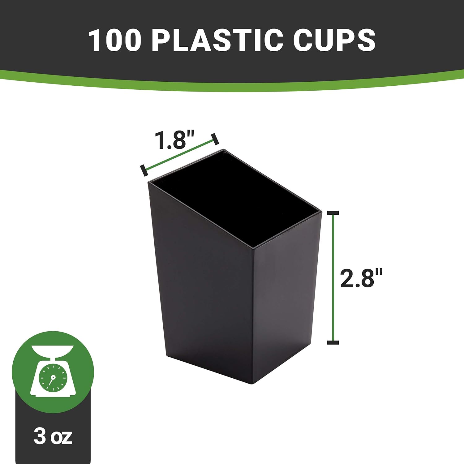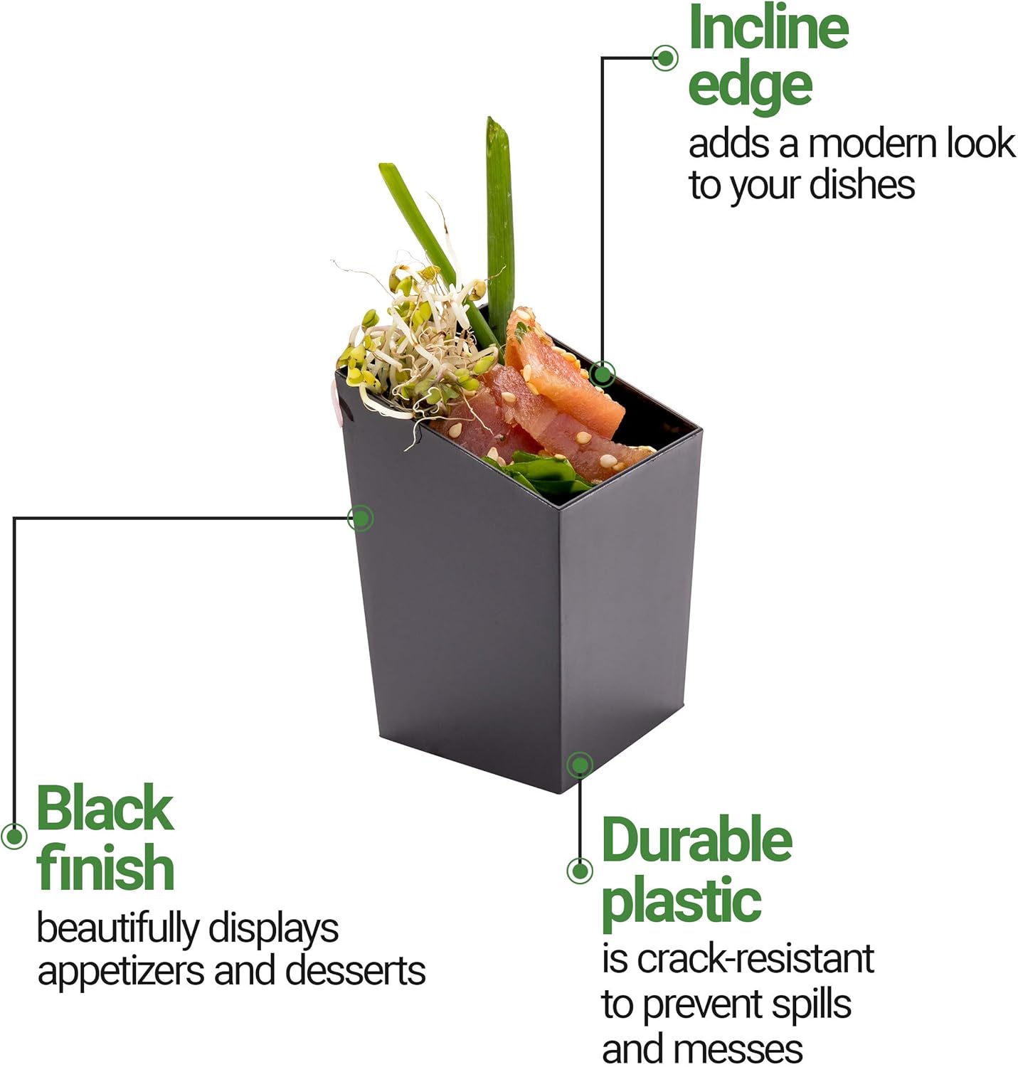 Make any party fabulous with our Mini Serve 3-ounce Square Black Plastic Incline Cups. These premium mini dessert cups are ideal for serving cold mousse, layered desserts, and more. With a sleek sloping edge, these sturdy black dessert cups securely hold condiments and appetizers. For easy access, these square incline cups have an angled design. Made of premium plastic, these black plastic dessert cups are durable enough for frequent use. Conveniently disposable, these inclined dessert bowls make cleaning up after events an easy affair. Flaunting a stylish square shape and black finish, these mini dessert cups add a modern touch to any food presentation. Easy to fill and transport, these lightweight mini dessert cups simplify service. These versatile 3-ounce cups measure 1.8 inches in length by 1.8 inches in width by 2.8 inches in height for the perfect single-serve portion. Sold in a 100 count box.